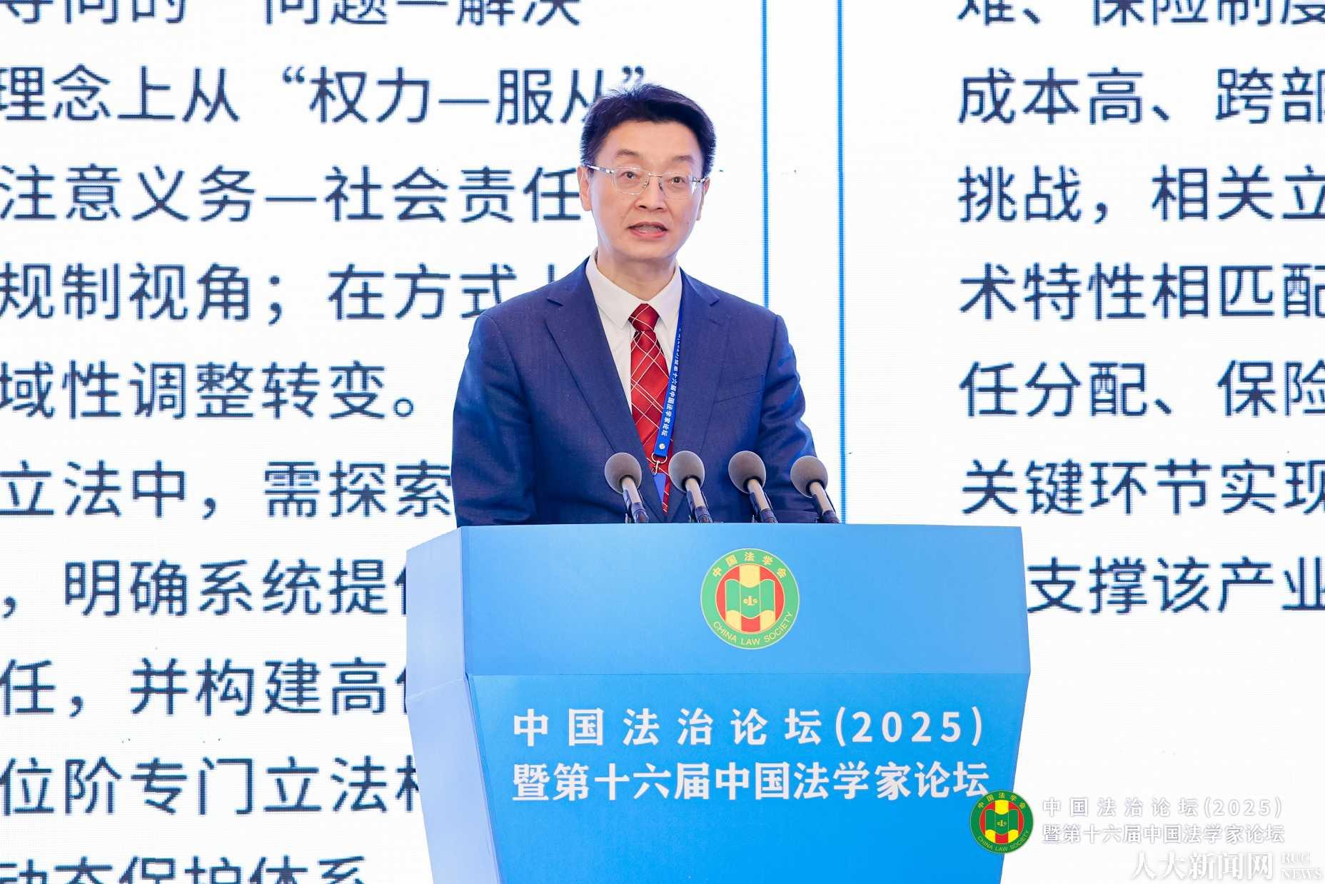 在下午的“法治助力高效能治理”与谈环节中,中国法学会立法学研究会常务副会长、中国人民大学法学院教授冯玉军以“贯彻落实党的二十届四中全会精神 加强新兴领域立法”为题发言,提出要促进实现碳达峰碳中和目标的立法、促进智能制造发展的立法、促进基因和细胞产业发展的立法。