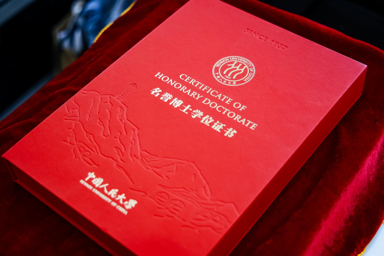 中国人民大学副校长郑新业宣读授予霍震霆先生名誉博士学位的决定。