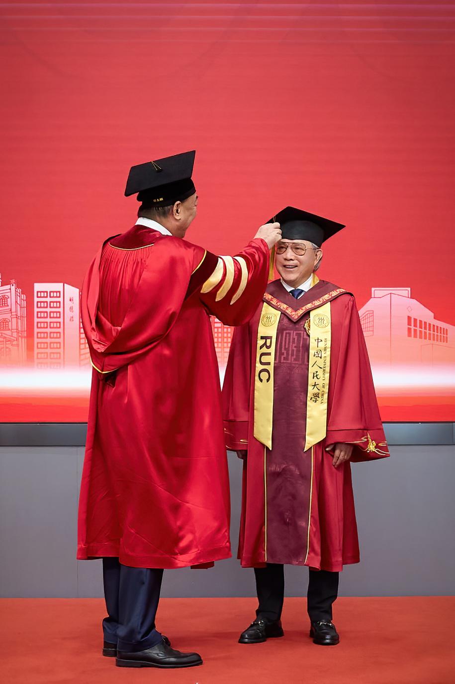 (中国人民大学党委书记张东刚为霍震霆先生拨穗、颁发学位证书)