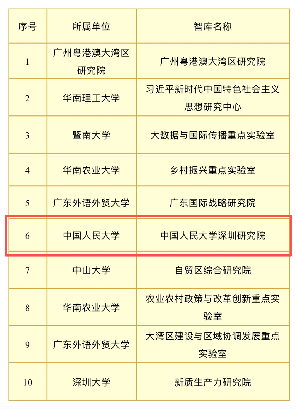 3月18日,根据《社科新型智库“强基攀登计划”实施方案(2025—2028)》要求,评审工作综合考量各智库建设基础、成果贡献、社会影响力及合作情况,广东省社会科学界联合会正式发布社科新型高端智库评审结果,全省共评定高端智库10家、重点智库20家。中国人民大学深圳研究院〔社会科学高等研究院(深圳)〕成功入选社科新型高端智库,是全省10家高端智库中唯一的异地高校科研机构。